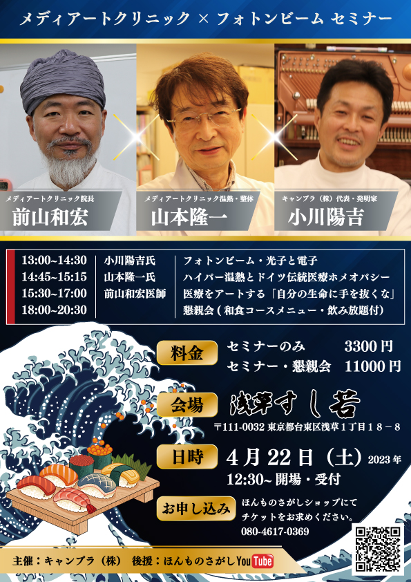 2023年5月24日 東京神楽坂でPHOTON BEAMのセミナーを開催します。発明家小川としてのセミナーはヒカルランドさん主催の”フォトンビームVol.1/水と電子と光子を統一[フォトンビーム照射実験・体験付]セミナー”是非こちらからお申し込みください。6月24日にも続編として開催しますがこれを最後に小川はPBとRIFE REMEDY後継機の製造業に注力するためしばらくセミナーを休まさせていただきます。
