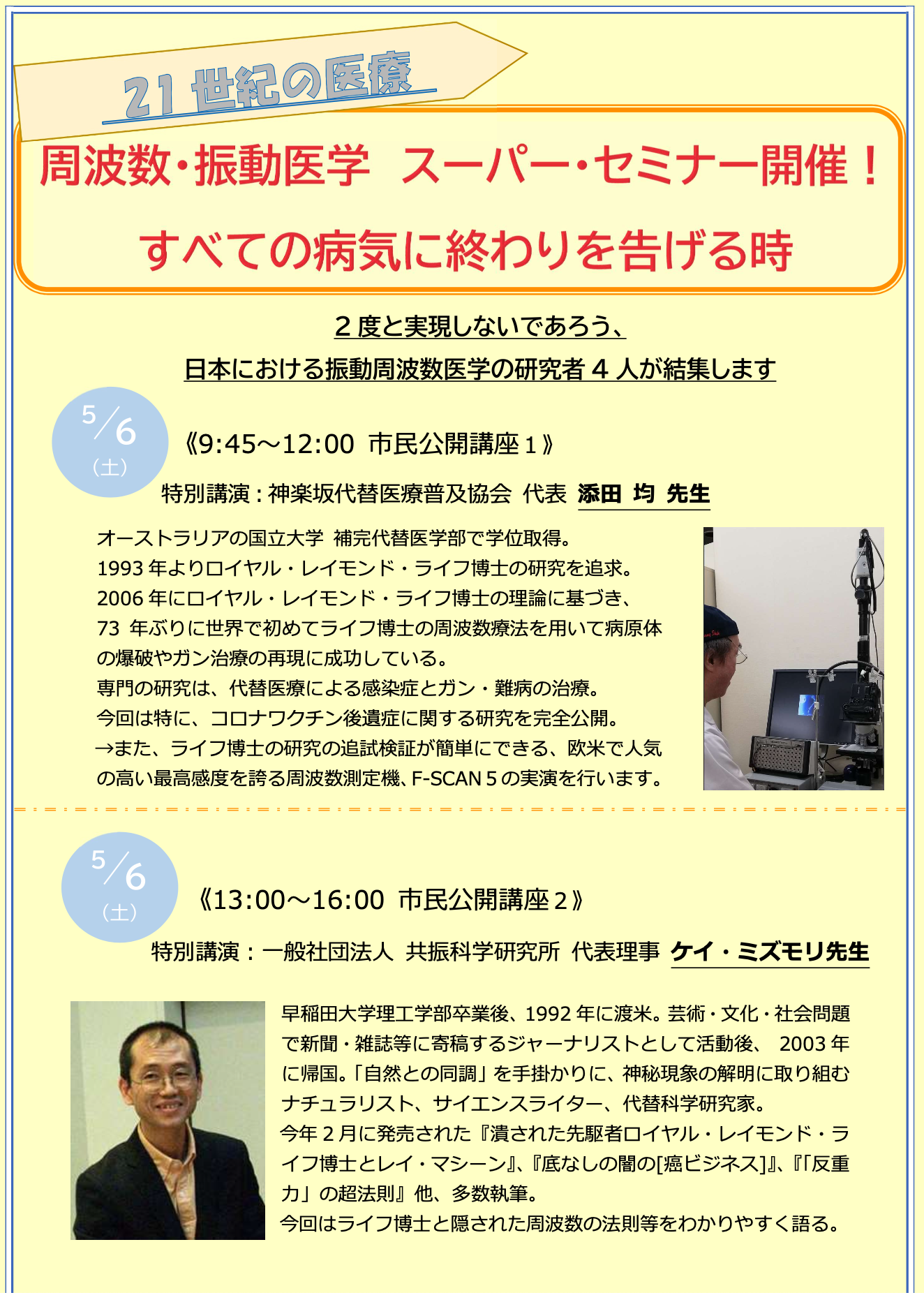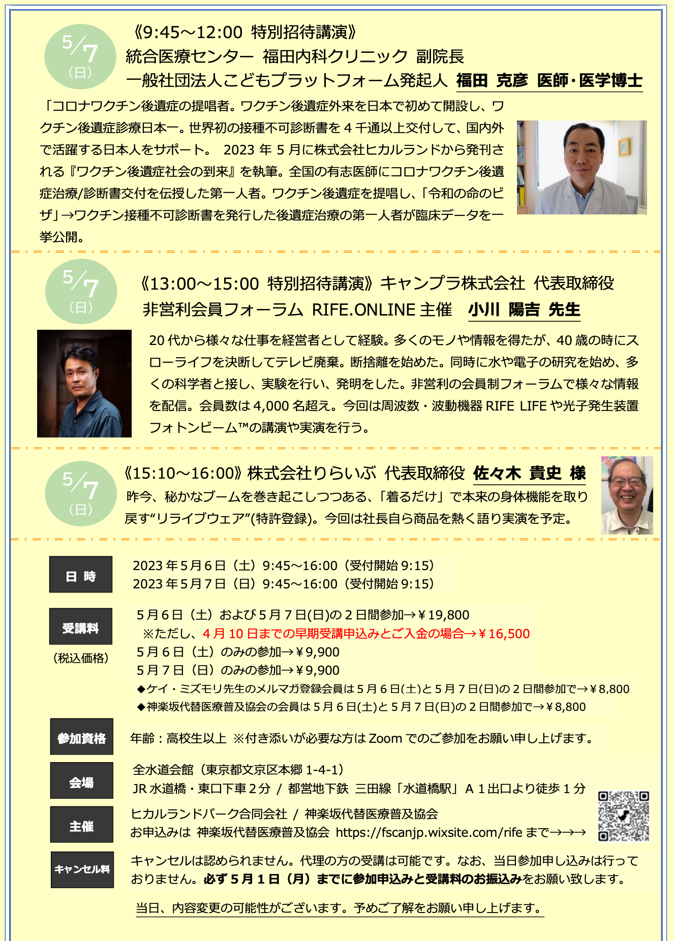 2023年5月7日 日本代替医療研究協会主催のセミナーを無事終えることができました。主催と講演をされた添田先生、講義されたケイ・ミズモリ先生、福田克彦先生、りらいぶ佐々木社長と40名の参加者スタッフの皆様にこの場を借りて心よりお礼申し上げます。